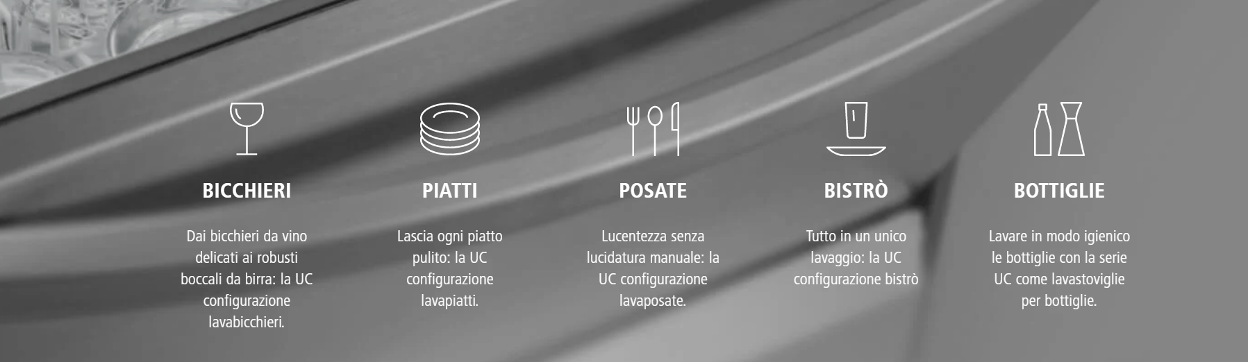 Realizzata su misura per le vostre stoviglie. La macchina è disponibile in varie dimensioni e si adatta perfettamente allo spazio che avete a disposizione. La Serie UC Mastepiece di Winterhalter convince perchè è intuitiva, per i consumi ridotti e per l’eccellente rapporto costo efficacia. La sua missione è rendere splendenti bicchieri, stoviglie e posate.